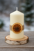 - Świeca z drewnianą podstawą i suszonymi dekoracjami może stać się częścią świątecznej aranżacji stolików w restauracjach i kawiarniach. Jej naturalny, ciepły wygląd idealnie pasuje do zimowego wystroju, tworząc przyjemną atmosferę dla gości.