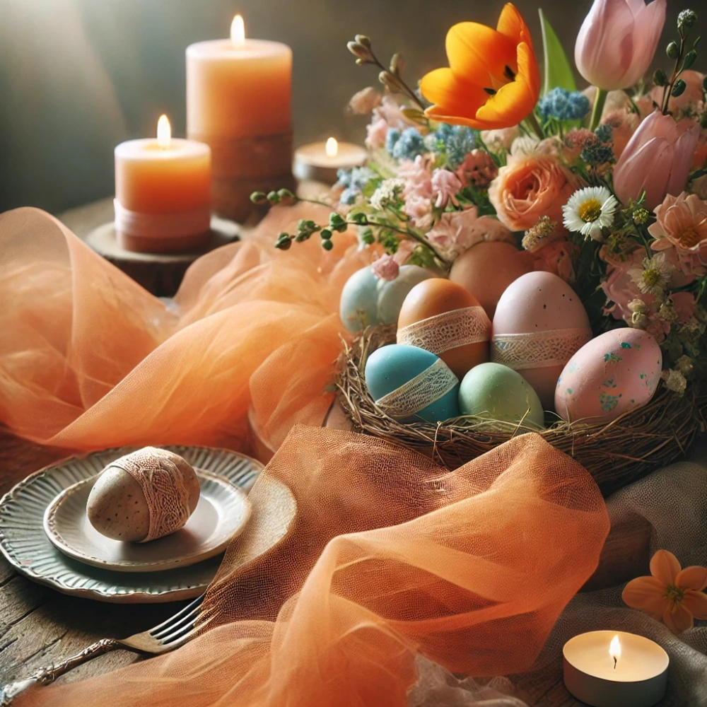wielkanocna dekoracja z pomarańczowym tiulem (12 cm szerokości), delikatnie wplecionym w aranżację. Kompozycja zawiera pastelowe pisanki, świeże wiosenne kwiaty, świece i rustykalne akcenty, tworząc ciepły i świąteczny klimat