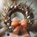 dekoracja wielkanocna w stylu loft z pomarańczowym tiulem (12 cm), wplecionym w nowoczesne, industrialne wnętrze. Połączenie surowych materiałów, takich jak drewno, metal i cegła, z delikatnymi pastelowymi jajkami, suszonymi kwiatami i świecami tworzy wyjątkowy kontrast – minimalistyczny, ale ciepły