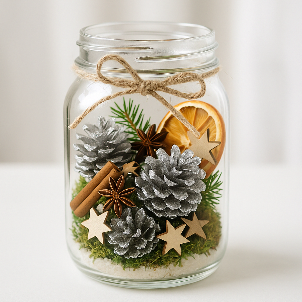 Dekoracja w słoju – wsyp sól jak „śnieg”, dodaj szyszki i mini led.