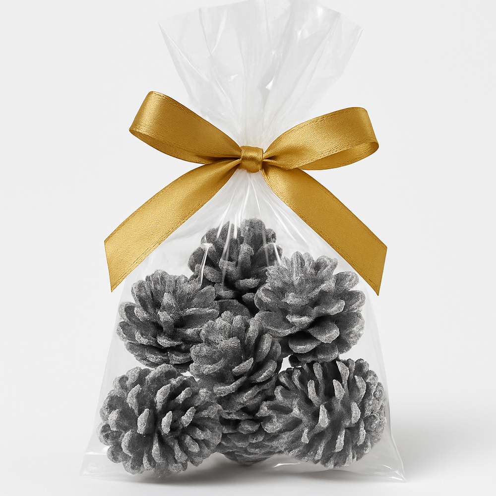 Pakowanie prezentów premium – srebrna szyszka + lniany sznurek zamiast kokardki.
