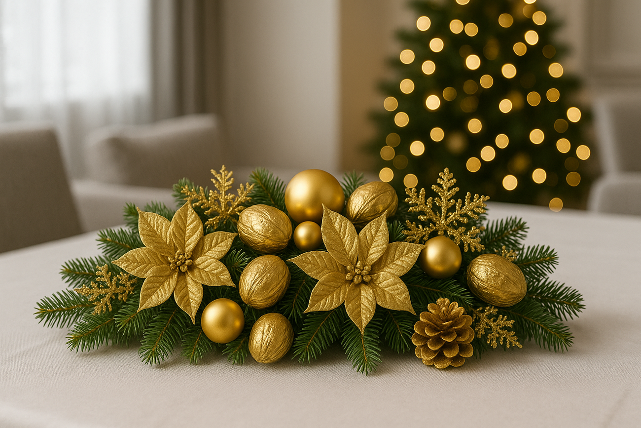 Złoto świetnie wygląda z drewnem, bielą, zielenią igliwia, a także z czernią i beżem przy dekoracjach nowoczesnych.