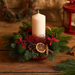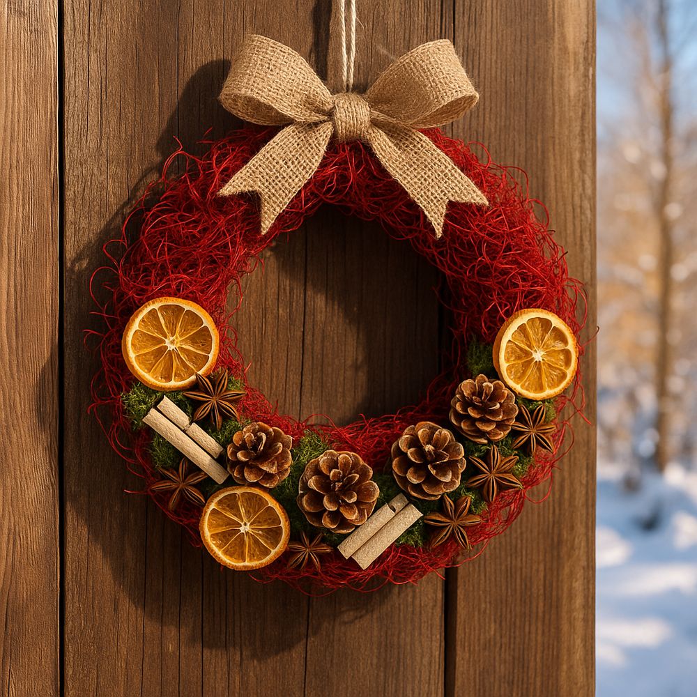 instrukcja wykonania zimowej dekoracji z użyciem czerwonego suszu egzotycznego (tzw. kręcony mech), szyszek, cynamonu i pomarańczy — w stylu naturalnym, rustykalnym i świątecznym: