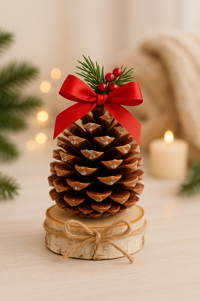 Materiały: naturalna szyszka, drewniana podstawa z brzozy, mech / gałązki / elementy dekoracyjne (w zależności od modelu)