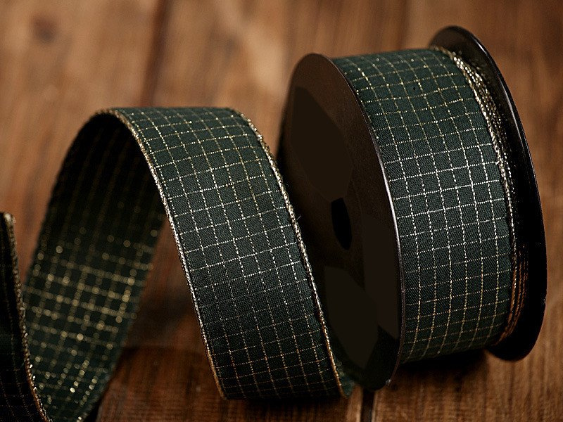 Wstążka świąteczna tkana – krata zielona z delikatną brokatową nitką 4 cm x 250 cm