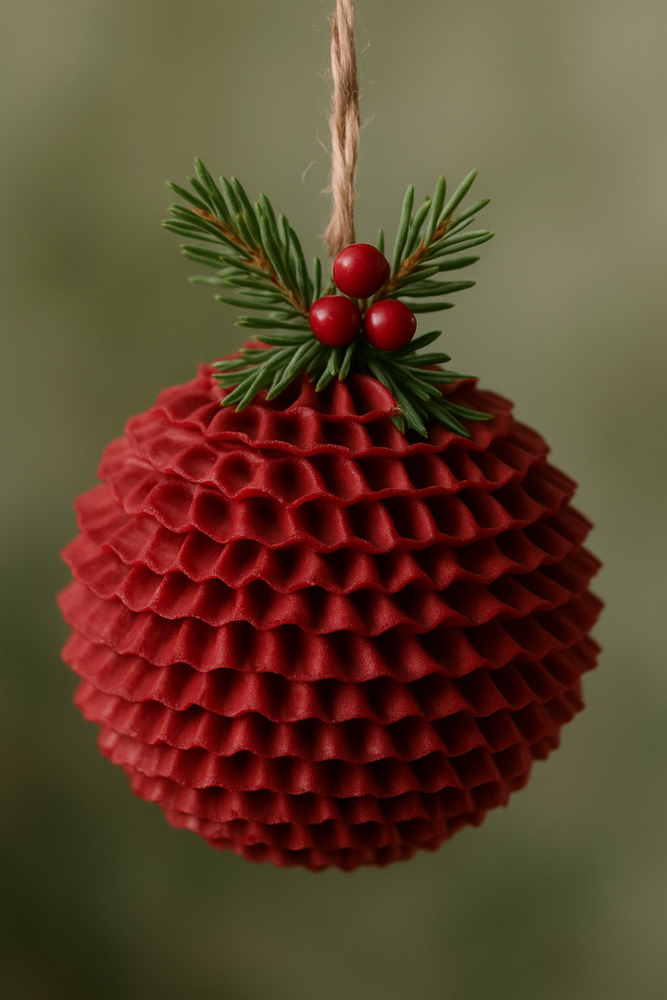 Bombki wykonano w intensywnym odcieniu czerwieni, który idealnie wpisuje się w klasyczną, świąteczną kolorystykę. Każda sztuka wyposażona jest w zawieszkę o długości 12 cm, wykonaną z cienkiego drucika zakończonego jutową końcówką – wygląda naturalnie, pasuje do wielu stylów (tradycyjny, rustykalny, boho, modern classic), a jednocześnie łatwo dopasujesz jej długość do gałązki.