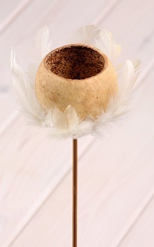 Rośliny suszone do kompozycji Bell cup na piku w naturalnym kolorze, ozdobione delikatnymi kremowymi piórami, to wyjątkowa dekoracja florystyczna stworzona na drewnianym piku. Średnica główki wynosi 6-8 cm, natomiast długość całkowita piku to 30 cm.