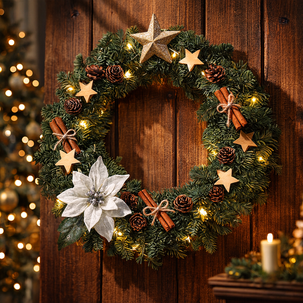 Wianek jest gęsty, miękki w dotyku i wyjątkowo trwały – idealny do klasycznych i nowoczesnych aranżacji. To dekoracja, która wygląda pięknie zarówno solo, jak i w wersji rozbudowanej o dodatki.