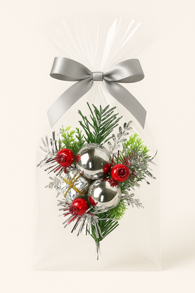 Te eleganckie gałązki świąteczne to doskonały sposób, aby nadać każdemu prezentowi lub aranżacji odrobinę luksusu i świątecznego blasku. Dzięki połączeniu srebrnych bombek z zielonymi i czerwonymi akcentami, stanowią one perfekcyjny balans między nowoczesnym stylem a tradycyjną świąteczną estetyką.