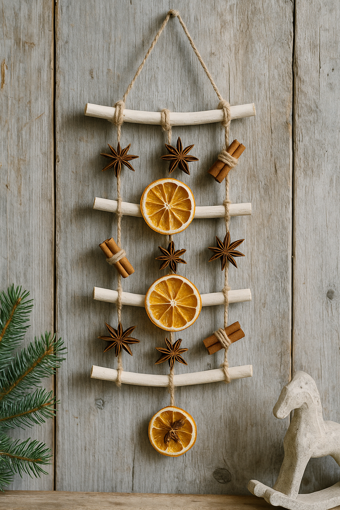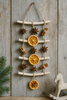 Patyki ułożone poziomo, przewiązane sznurkiem i ozdobione: szyszkami, plastrami pomarańczy, anyżem, zawieszkami z MDF.