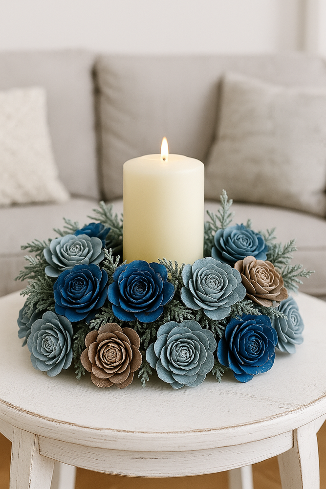 Biało-niebieskie róże cedrowe to eleganckie, naturalne dekoracje świąteczne, które sprawdzą się doskonale w różnych projektach dekoracyjnych oraz DIY. Ich subtelne połączenie bieli z niebieskimi akcentami nadaje kompozycjom zimowy, mroźny charakter, idealnie komponując się z typową paletą bożonarodzeniowych ozdób.