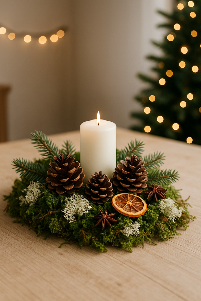 – mech + tealight w szklanym kieliszku + szyszka → szybki, tani, naturalny.