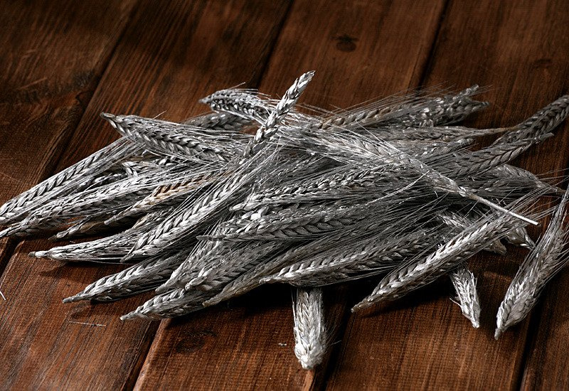 Naturalnie suszone kłosy zboża malowane na elegancki, metaliczny srebrny kolor. Krótka długość (ok. 10 cm) sprawia, że są gotowe do wklejenia w stroiki, wieńce i dekoracje stołowe. To praktyczny materiał florystyczny, chętnie używany w ozdobach zimowych, bożonarodzeniowych i glamour.