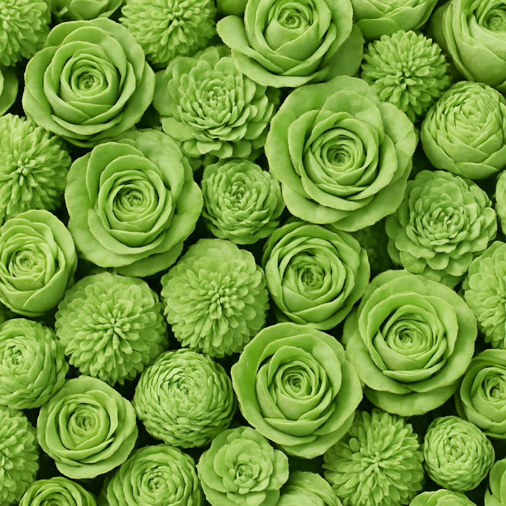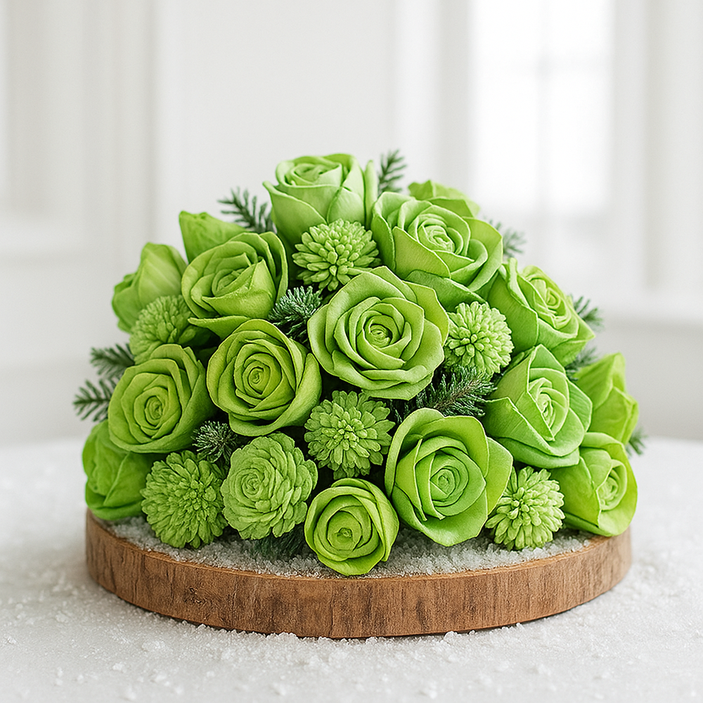 Dzięki mixowi rozmiarów (2–6 cm) kwiaty świetnie sprawdzą się zarówno w większych stroikach, jak i w drobnych dekoracjach, np. na serwetkach, bombkach, mini-wieńcach czy świecach. Kolor świeżej zieleni doskonale łączy się z bielą, srebrem, szkłem i naturalnym drewnem,