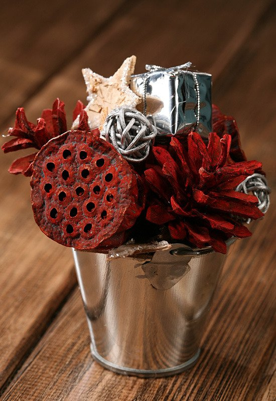 Ta wyjątkowa świąteczna kompozycja w tonacji czerwieni o wymiarach około 6/8 cm to idealna dekoracja na Boże Narodzenie. Umieszczona w metalowym wiaderku, wypełniona jest świątecznymi ozdobami: czerwonymi szyszkami, orzeszkami, gwiazdkami oraz innymi dodatkami. To elegancka dekoracja, która wprowadza ciepły, radosny nastrój i pięknie wpasowuje się w świąteczny klimat.