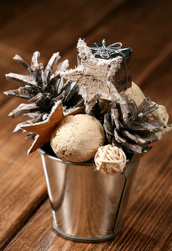 Ta urocza kompozycja o wymiarach około 6/8 cm to idealna dekoracja na święta. Umieszczona w metalowym wiaderku, wypełniona jest różnorodnymi świątecznymi ozdobami, takimi jak szyszki, orzeszki, gwiazdki i inne dodatki. Dzięki swojej estetyce i stylowemu wykończeniu, kompozycja doskonale wpisuje się w świąteczny klimat, a tonacja biała dodaje jej elegancji i lekkości.