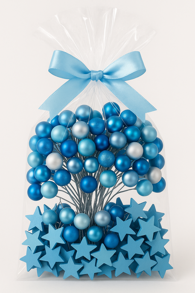 Zestaw obejmuje 90 bombek na druciku w trzech rozmiarach (2 cm, 3 cm oraz 4 cm) oraz 36 drewnianych gwiazdek w odcieniach jasnego i głębokiego błękitu. Całość zapakowana w elegancki woreczek celofanowy, przewiązany szeroką, satynową kokardą w kolorze baby blue – gotowa na prezent albo do natychmiastowego wykorzystania w dekoracjach.