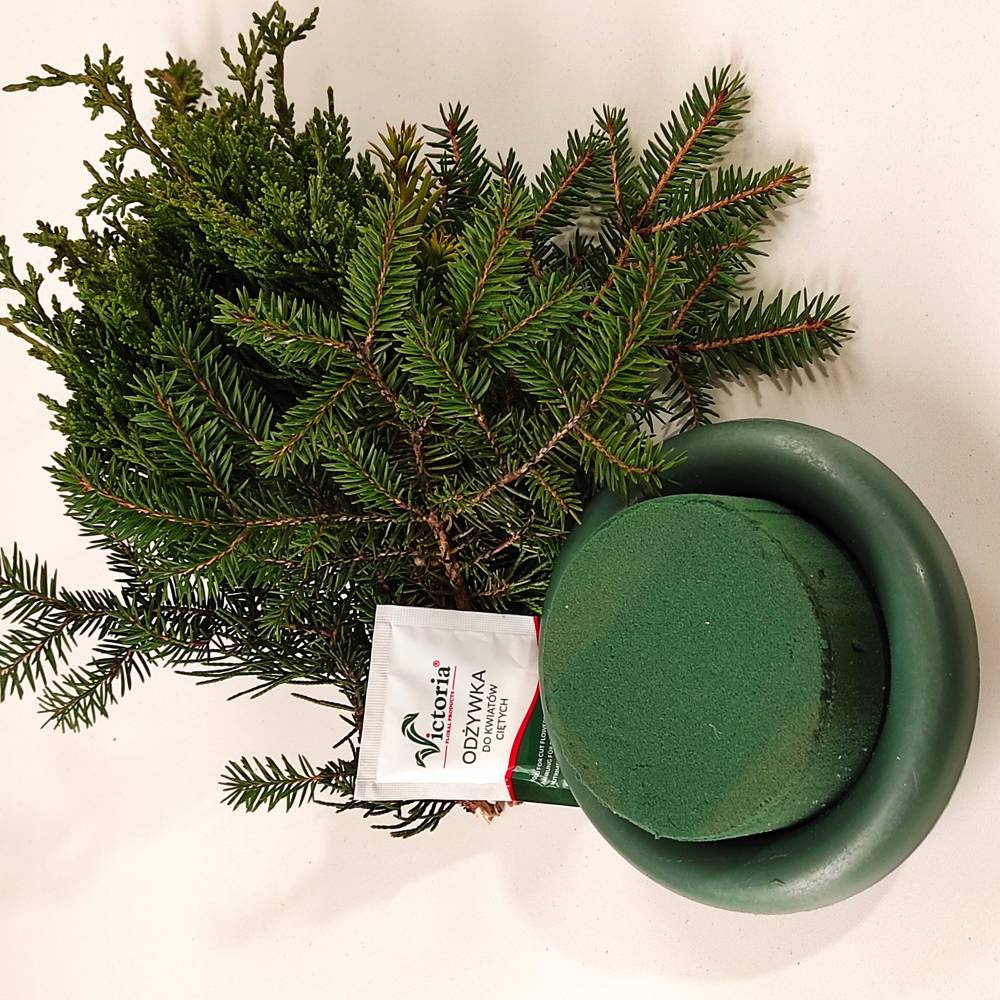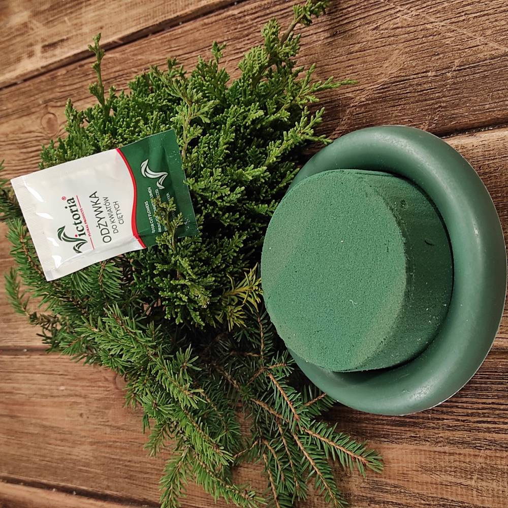 Cena gąbki florystycznej za zestaw: cylinder z gąbki wraz z odżywką i pojemnikiem wielokrotnego użytku, gałązki świąteczne, świeża zieleń