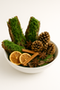 Dekoracja w szkle – ułóż kawałki kory z mchem w dużym słoju lub misie, dodaj szyszki, plasterki pomarańczy, gwiazdki drewniane, świeczkę LED.