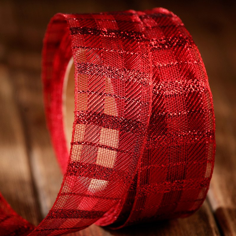 Wstążka świąteczna czerwona kratka z lekkim brokatem 40mm / 250 cm – Klasyczna elegancja z odrobiną blasku