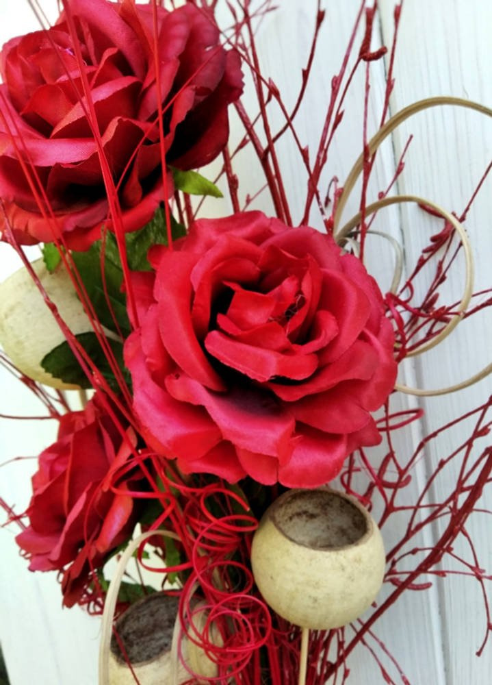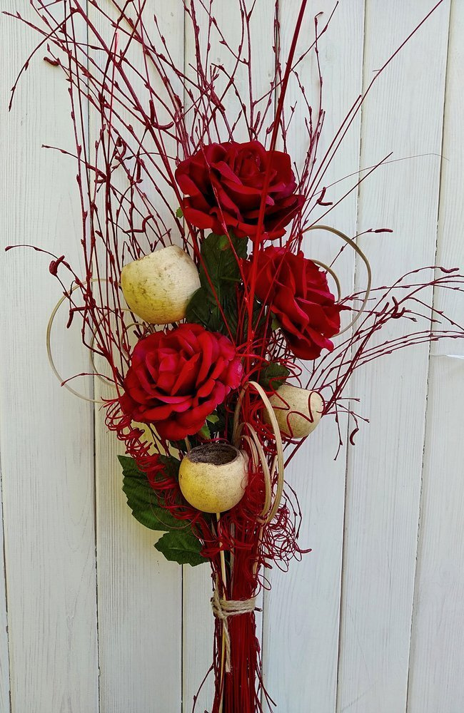 Bukiet świąteczny w tonacji czerwonej z różami, suszem egzotycznym i barwionymi gałązkami o wysokości 40-50 cm to piękna propozycja na prezent oraz dekorację wnętrza w świątecznym stylu. Oto inspiracje i elementy, które mogłyby znaleźć się w takim bukiecie: