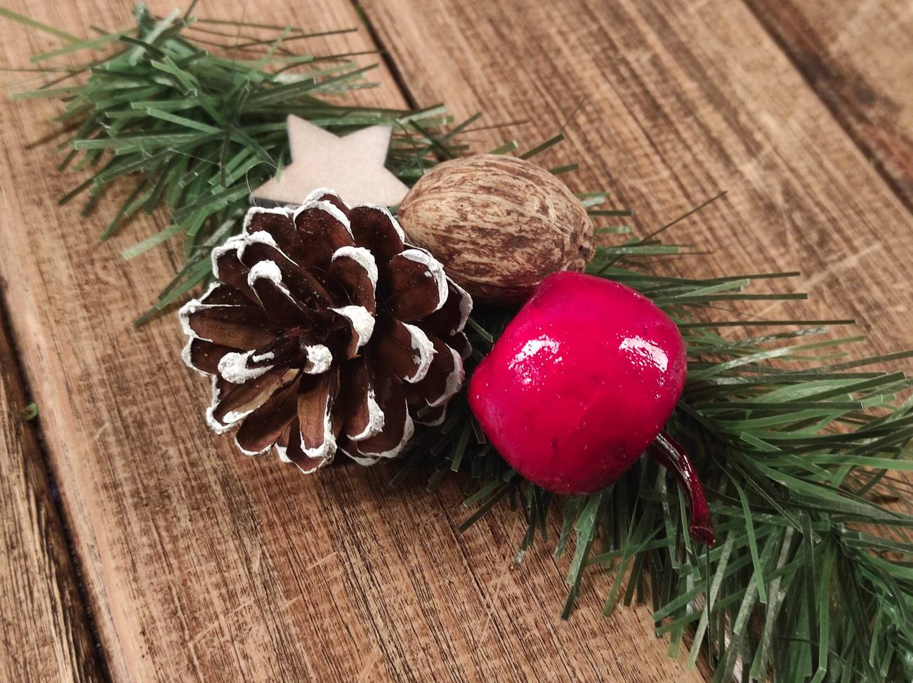 Gałązki świąteczne to doskonały dodatek do prezentów i świątecznych dekoracji, które podkreślają magiczną atmosferę Bożego Narodzenia. Ozdoby prezentowe składające się z trwałego igliwia oraz starannie dobranych dodatków, takich jak drewniana gwiazdka, szyszka z ręcznie malowanymi brzegami, orzeszek amry i czerwone jabłuszko, tworzą elegancką i naturalną kompozycję.