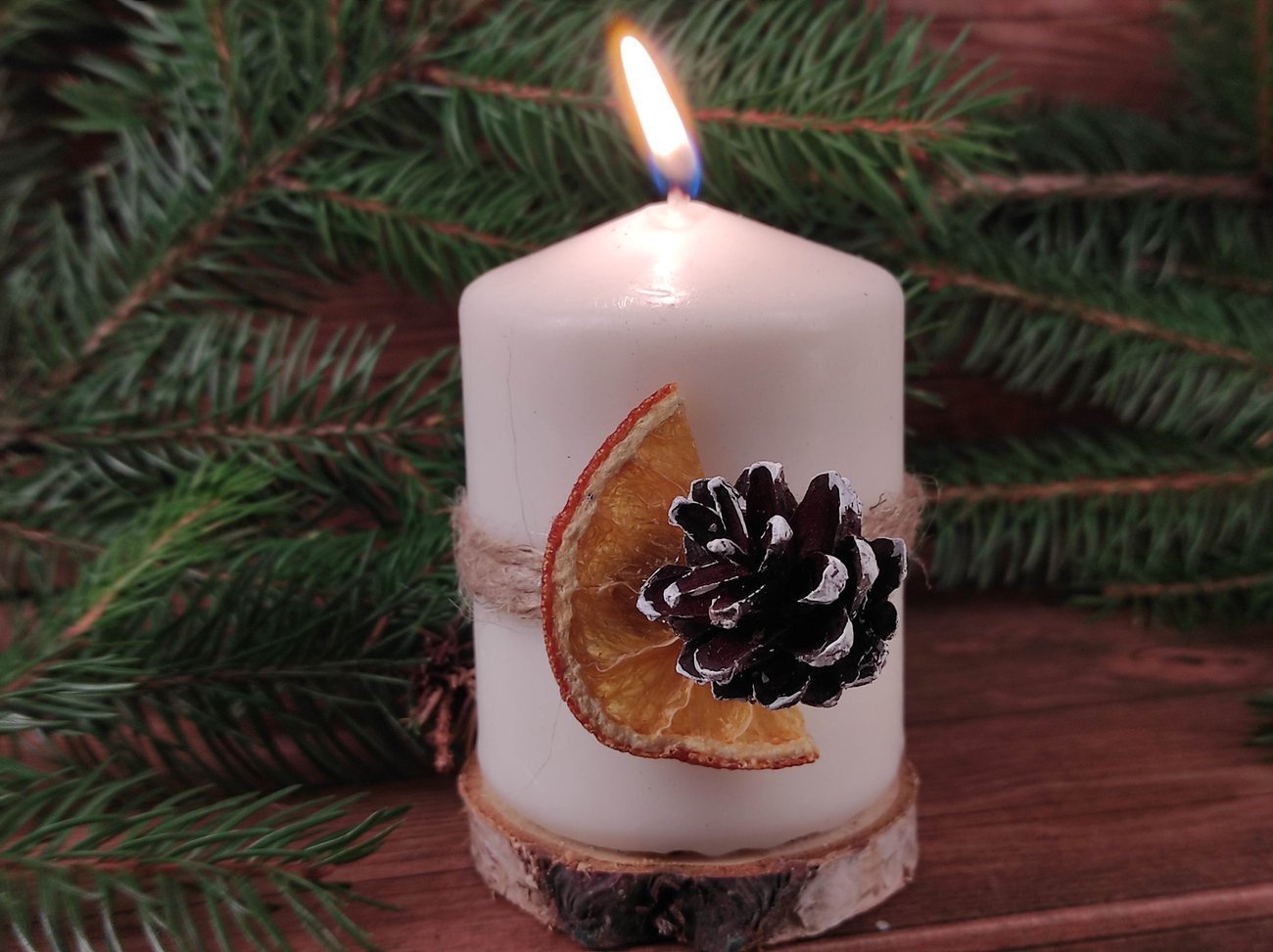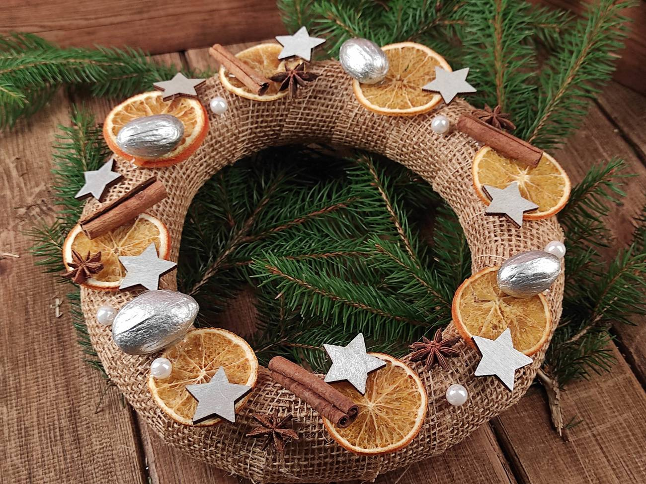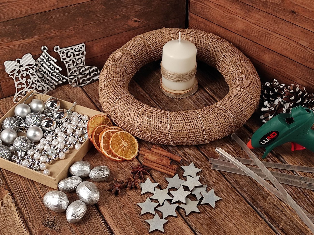 • wianek jutowy 25 cm, świeczka z jutą 6/8 cm. Czas palenia 15 godz.plaster drewna, perełki, bombki, susz świąteczny pomarańcze w plastrach,laski cynamonu,gwiazdki anyżu, orzechy egzotycznej amry, drewniane gwiazdki, pistolet i zapas kleju na gorąco
