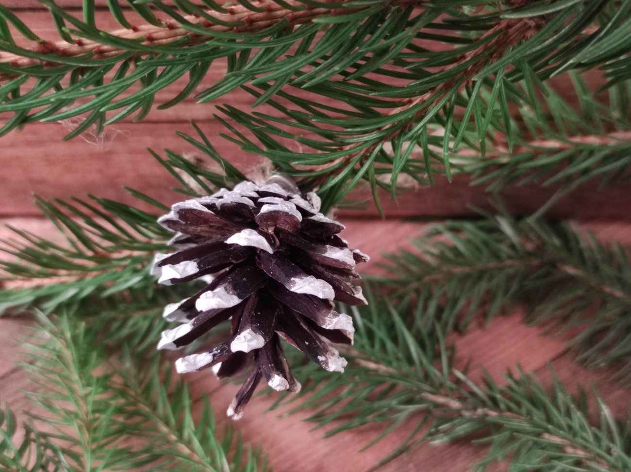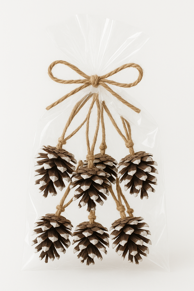 Każda szyszka została starannie oczyszczona, pomalowana i zawieszona na jutowym sznurku, dzięki czemu zachowuje swój naturalny charakter w połączeniu z subtelnym, zimowym akcentem.