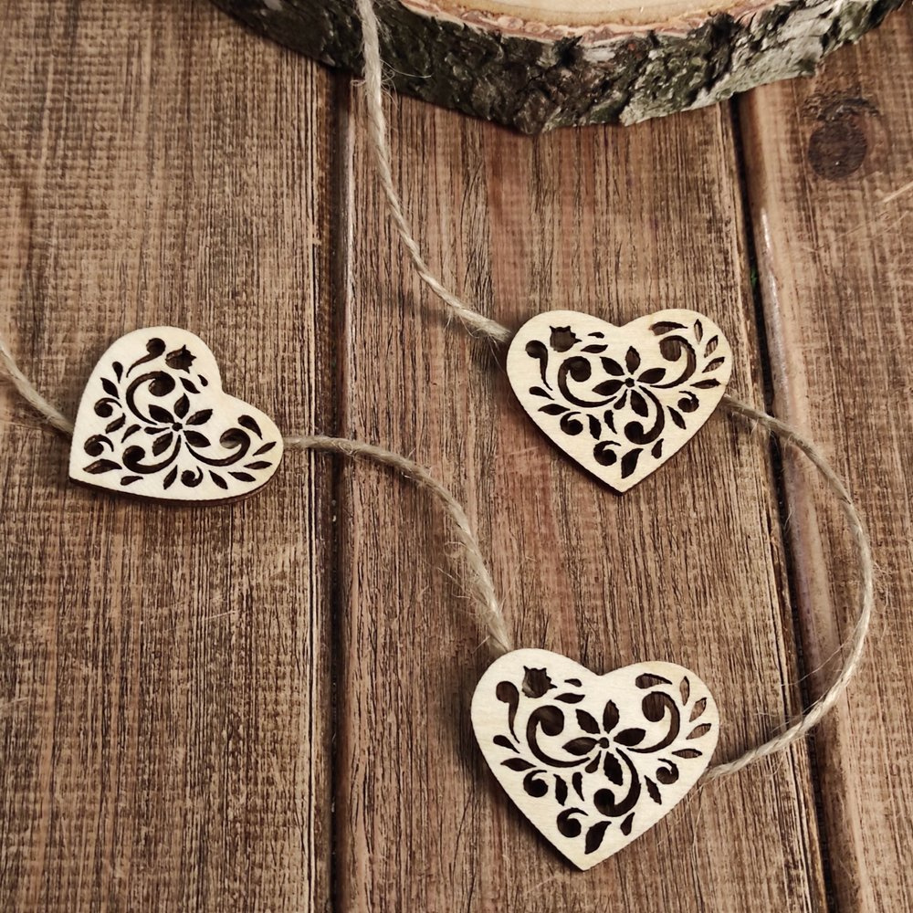 Wyjątkowy Design: girlanda serc ma długość 200 cm i zawiera 9 drewnianych serc o średnicy 4 cm. Serca są wykonane w ażurowym stylu, co dodaje im lekkości i delikatności. Połączenie juty z drewnianymi sercami tworzy kompozycję o naturalnym uroku i wyjątkowym charakterze.
