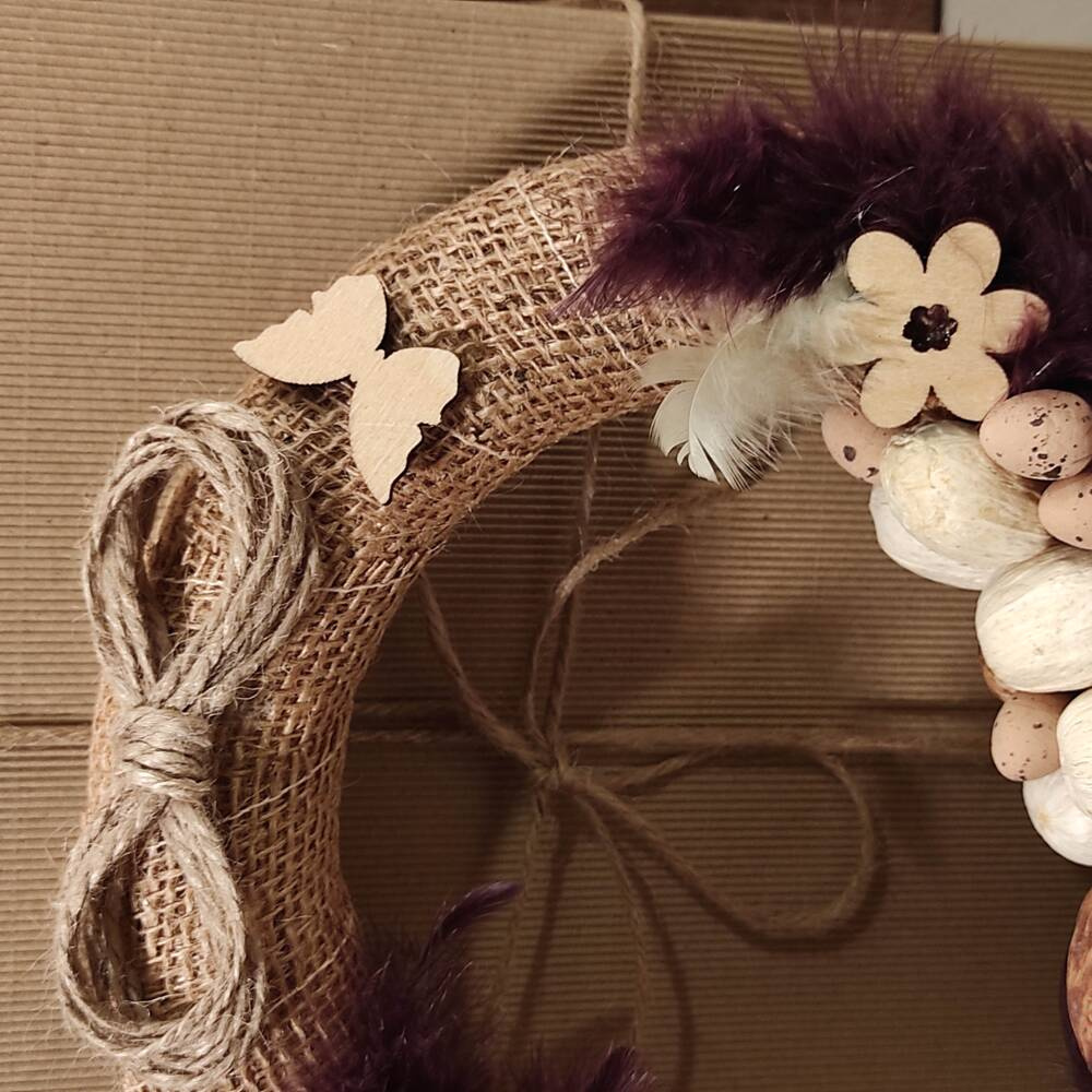 Wiosenna Kompozycja: Wianek o średnicy 25 cm osadzony jest na jutowej podstawie, co dodaje mu naturalnego uroku. Dekoracje w tonacji brązowo-naturalnej oddają delikatność i harmonię wiosny.