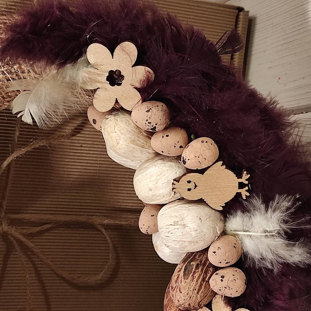Ten ręcznie wykonany wianek o średnicy 25 cm stanowi idealną ozdobę na Wielkanoc. Wykorzystano jutową podstawę, która nadaje mu naturalny, rustykalny charakter. Dekoracje w kolorystyce brązowo-naturalnej, takie jak piórka wielkanocne, drewniane figurki wiosenne, suszone rośliny, wielkanocne jajeczka i jutowa kokarda, tworzą harmonijną i elegancką kompozycję. Wianek doskonale sprawdzi się jako dekoracja drzwi, okna lub świątecznego stołu, wprowadzając wiosenny nastrój do każdego wnętrza.