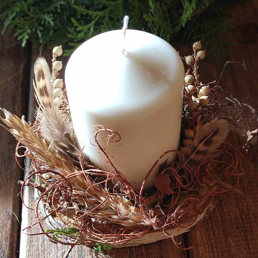 Dekoracja ze świecą na drewnianym plastrze to harmonijne połączenie naturalnych materiałów i egzotycznych akcentów, które wprowadzą ciepły, przytulny klimat do każdego wnętrza. Dzięki swojej eleganckiej prostocie i staranności wykonania jest doskonałym wyborem na dekorację stołu lub stylowy prezent.