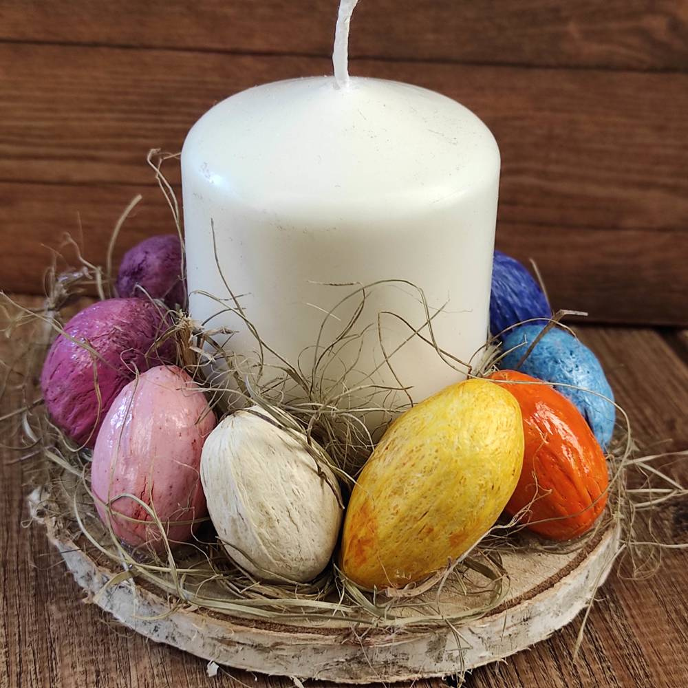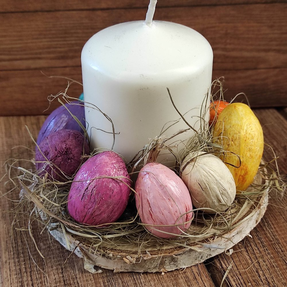 Nasz stroik wielkanocny z egzotycznymi owocami amry to nie tylko ozdoba stołu, ale prawdziwa odyseja kolorów. Przeniesie Cię w egzotyczną podróż, jednocześnie podkreślając magiczną atmosferę Świąt Wielkanocnych. Dzięki starannej pracy rąk naszego rzemieślnika, ten stroik stanie się wyjątkowym dodatkiem do Twojego wnętrza, przynosząc świeżość i radość wiosny