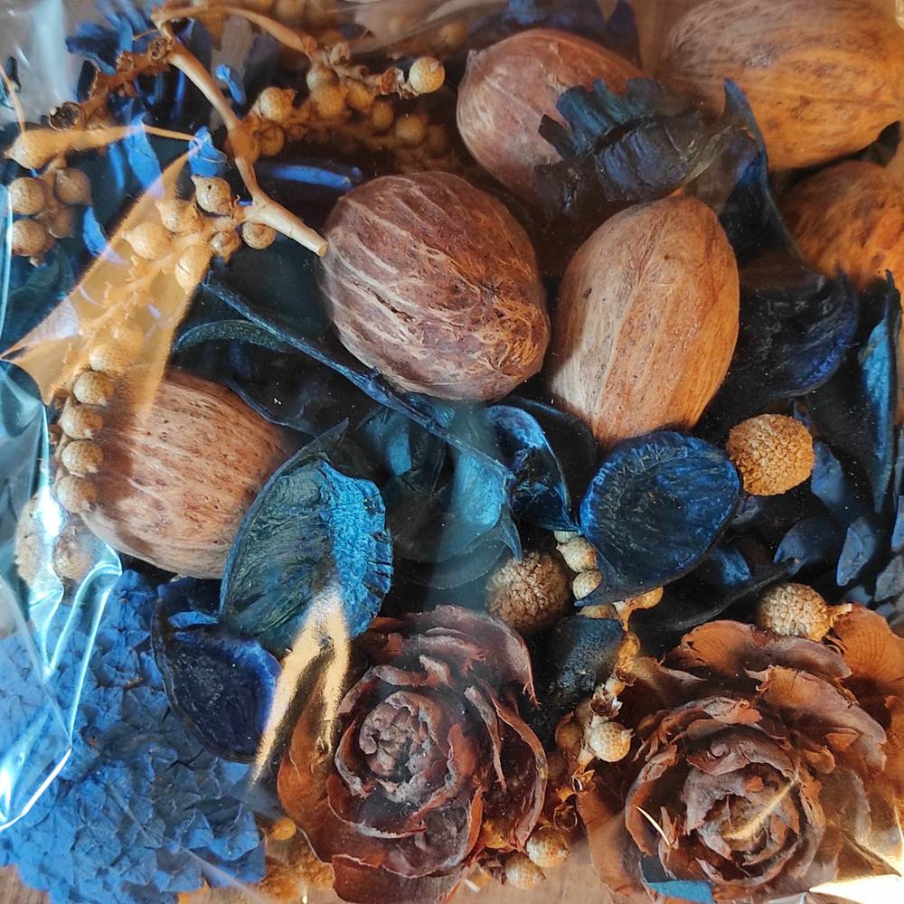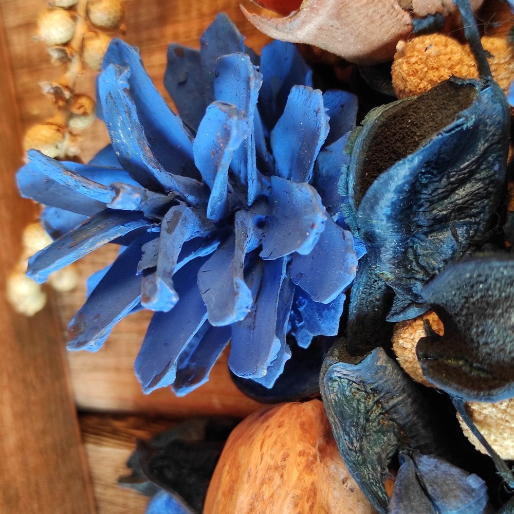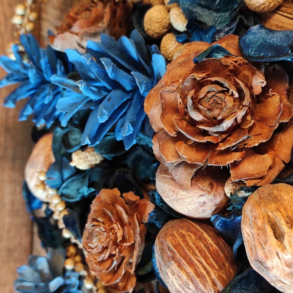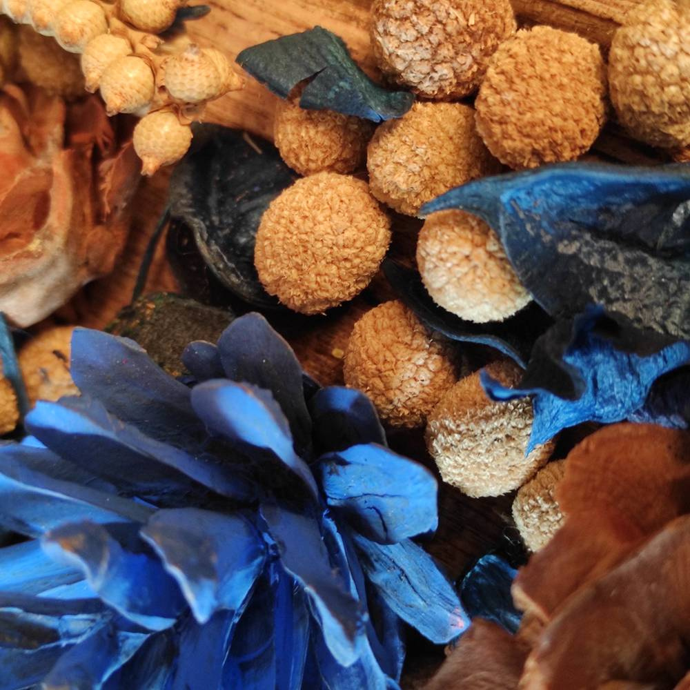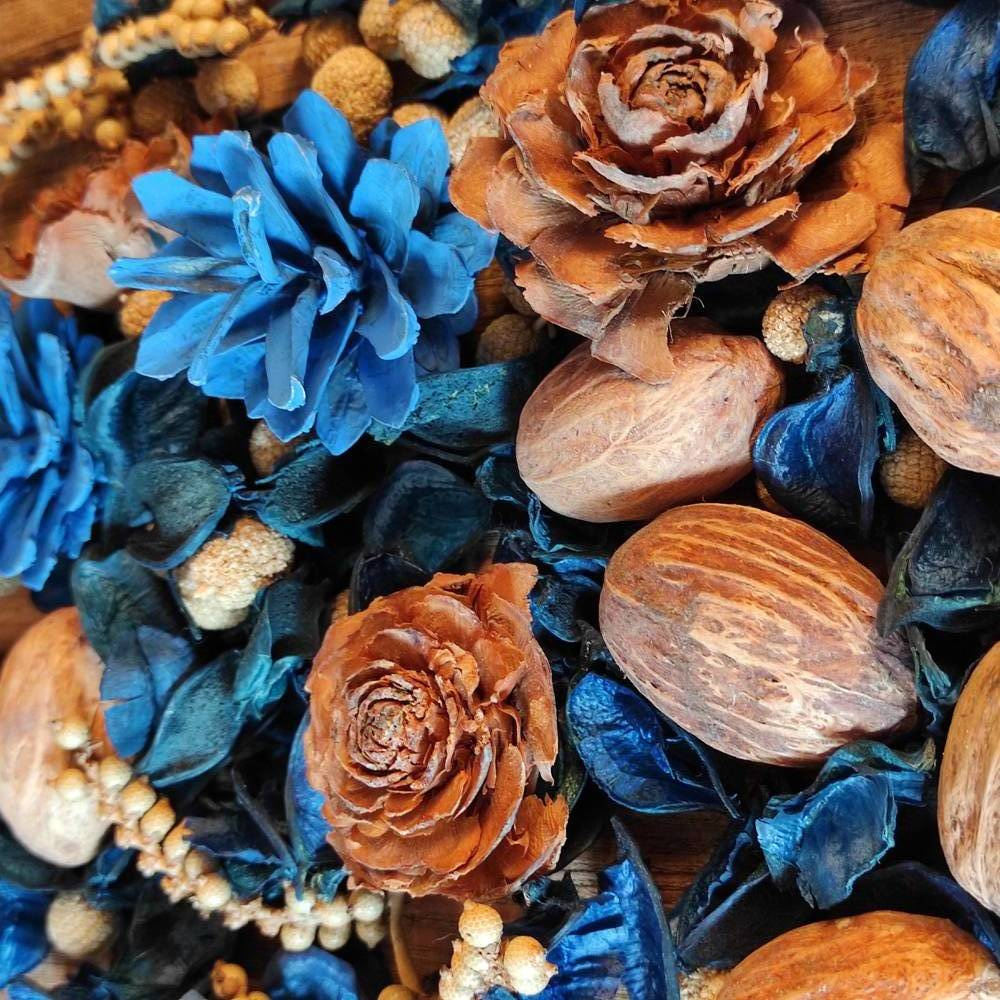 Opis: Potpourri "Błękitna Melodia" to misternie skomponowane połączenie suchych roślin, kwiatów oraz dekoracyjnych dodatków, które nie tylko doskonale przedłużą trwałość dowolnego zapachu, ale również stanowią elegancką ozdobę wnętrza. Oparta na tonacji brązowo-niebieskiej kompozycja dodaje wyjątkowego charakteru każdemu pomieszczeniu.