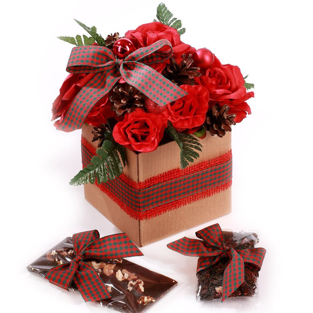 Zestaw Prezentowy Świąteczny – Flowerbox z Kwiatami, Herbatą i Czekoladą