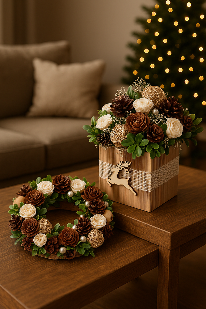 ✔ Naturalne materiały – drewno, szyszki, rattan, juta, zieleń