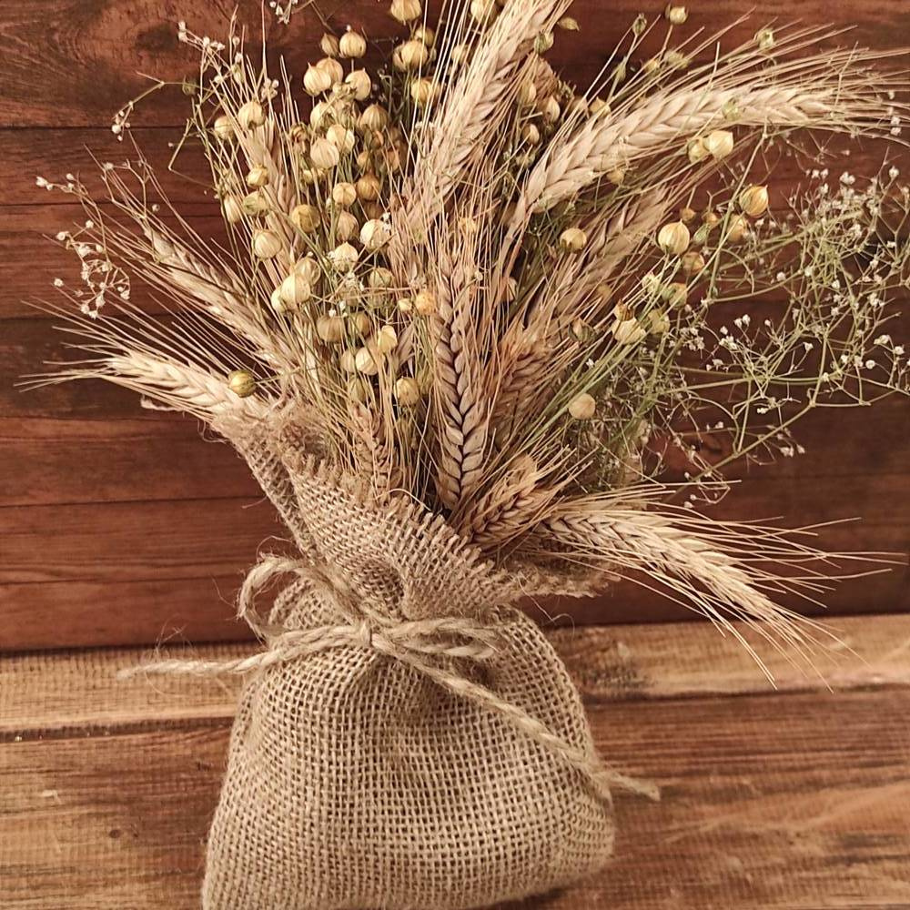 Dekoracja ze zboża w postaci bukietu suszonego zboża w woreczku jutowym to wyjątkowa kompozycja, która łączy w sobie naturalny urok oraz kreatywny design.