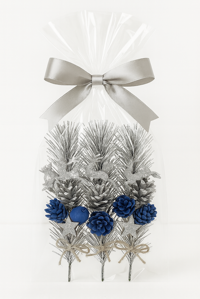 Gałązki świąteczne srebrno-granatowe doskonale nadają się na prezenty firmowe, gdy chcesz podkreślić znaczenie detali oraz elegancji w swoim podejściu do partnerów biznesowych. Ich srebrny blask symbolizuje sukces i prestiż, co czyni je idealnym dodatkiem do profesjonalnych upominków. Granatowe szyszki w połączeniu z brokatem wprowadzają nutę nowoczesności, a drewniana gwiazdka dodaje naturalnego ciepła – doskonała równowaga pomiędzy elegancją a świątecznym nastrojem.