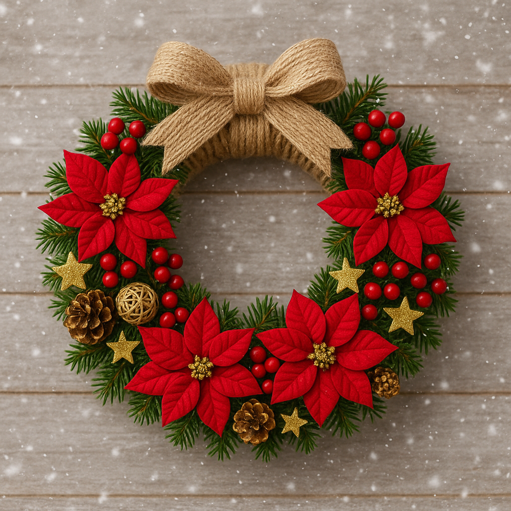 Piękny, świąteczny wianek z naturalnej juty i sztucznego igliwia to klasyczna ozdoba w ciepłych, bożonarodzeniowych barwach. Wykonany ręcznie z dbałością o każdy detal, ozdobiony został czterema czerwonymi gwiazdami betlejemskimi, złotymi gwiazdkami i szyszkami, ratanowymi kulkami oraz gałązkami z czerwonymi kuleczkami.