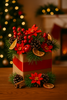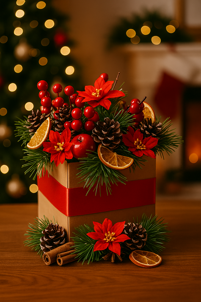 Świąteczny Stroik Prezentowy 25 cm – Kompozycja z Poinsecją, Cynamonem, Szyszkami i Cytrusami, zapakowana w elegancki celofan z kokardą