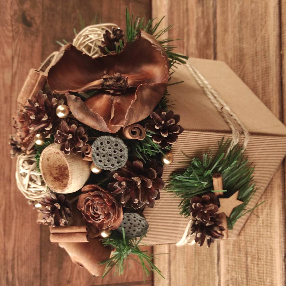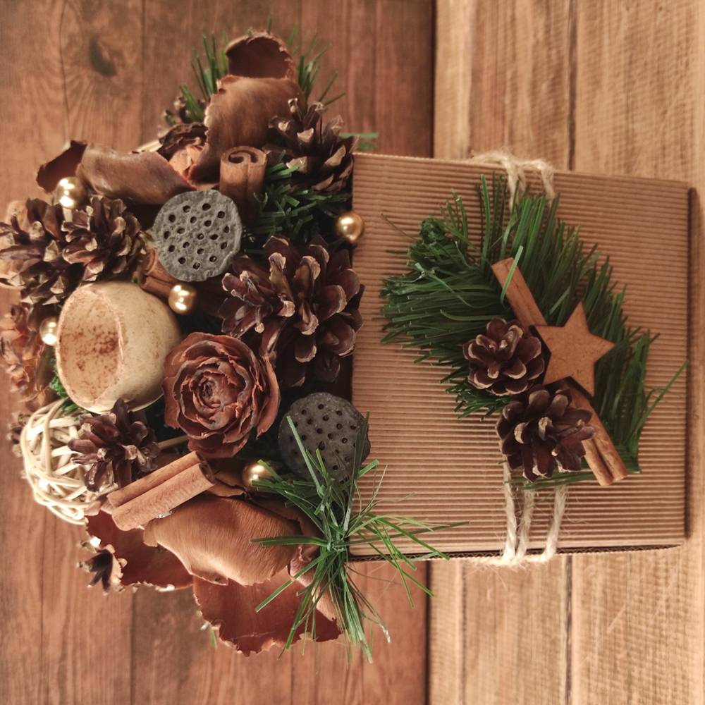 materiały: szyszki, cynamon, suszone owoce, mech, rattan, gałązki iglaste