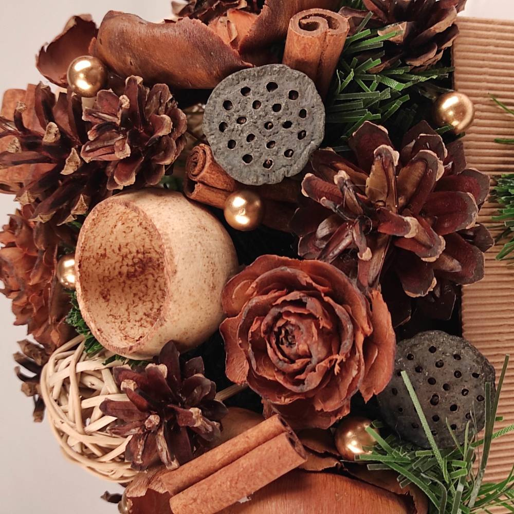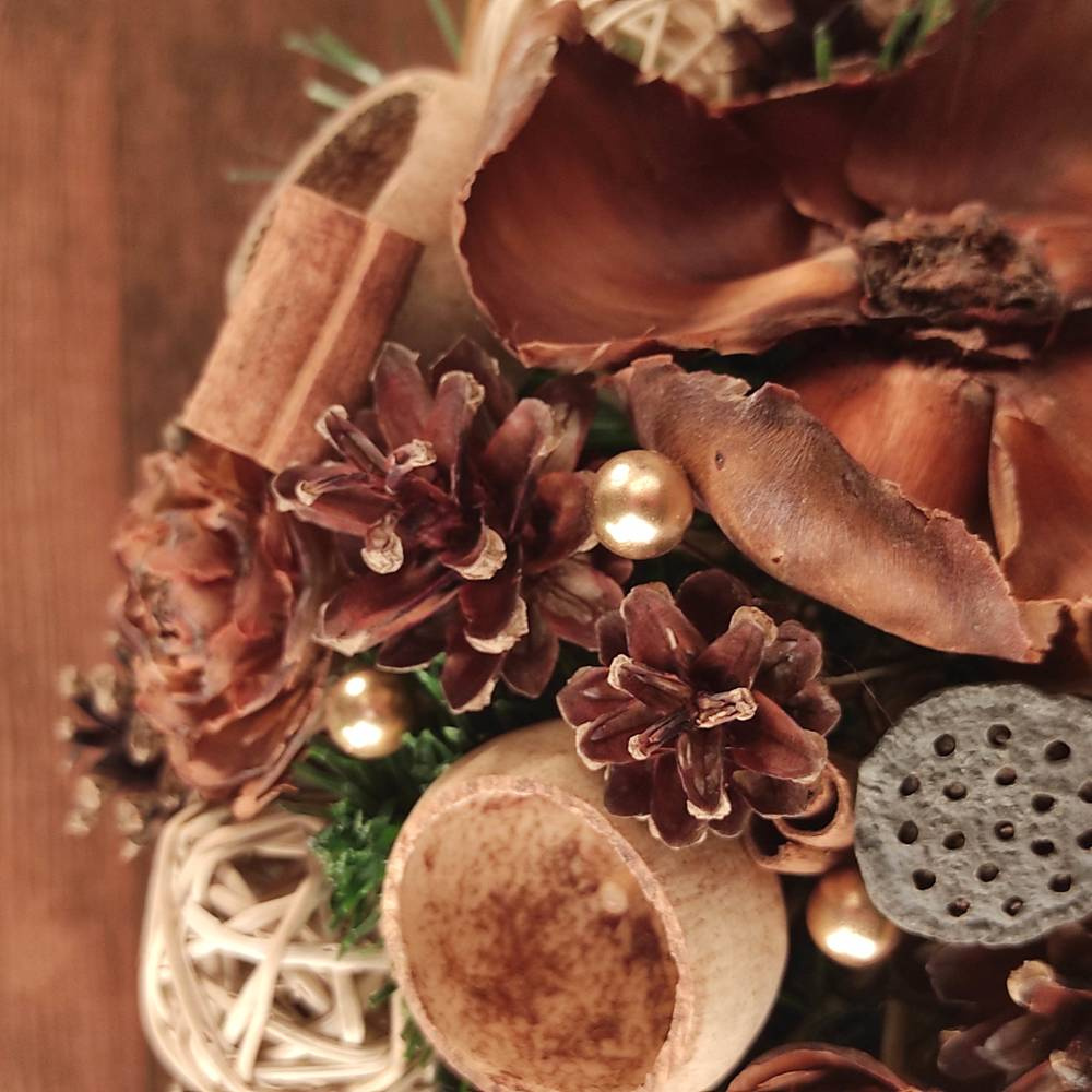 ręcznie układana kompozycja w ciepłej, brązowo-zielonej kolorystyce, idealna do wnętrz w stylu rustykalnym, eko lub skandynawskim.