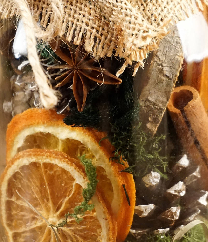 Pachnące sianko, cynamon, pomarańcze i anyż wprowadzają do wnętrza intensywny, świąteczny aromat, który natychmiast kojarzy się z ciepłem i przytulnością Bożego Narodzenia. Naturalne zapachy są bardziej trwałe i subtelne niż syntetyczne odświeżacze, co dodaje kompozycjom autentyczności.