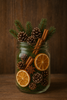 Las w słoiku to wyjątkowa, naturalna dekoracja świąteczna, stworzona z prawdziwego igliwia, suszonych plastrów pomarańczy, lasek cynamonu i gwiazdek anyżu.