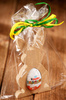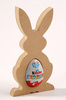 Zajączek, figurka drewniana do zdobienia. Można ją malować, oklejać i zdobić różnymi technikami dekoratorskimi. Jajko Kinder Niespodzianka jest dodawane do produktu.Całość ciekawie opakowana celofanem i wiosenną rafią.