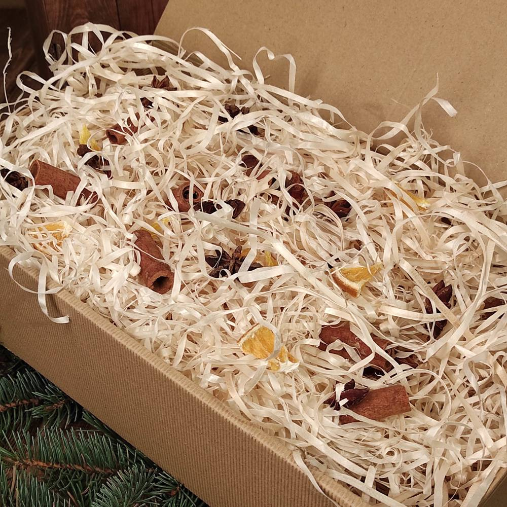 Włosy drewniane z dodatkami cynamonu, anyżu i pomarańczy to estetyczny, ekologiczny wypełniacz, który nadaje dekoracjom świątecznym naturalnego uroku i subtelnego zapachu. To uniwersalny i trwały materiał, który może być używany na wiele sposobów, od wypełnienia koszyków prezentowych po tworzenie świątecznych stroików.