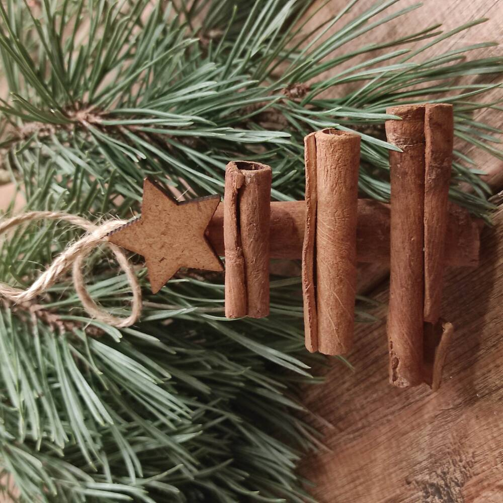 Materiał: laski cynamonu, drewniana gwiazdka, sznurek jutowy