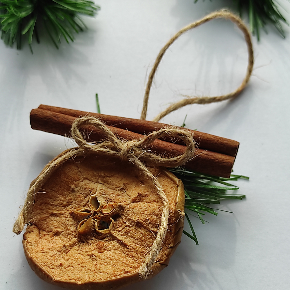 Suszone jabłko: Dwustronna zawieszka składa się z suszonego plasterka jabłka, co nadaje jej autentyczności i naturalnego uroku. Jabłko to symbol obfitości, zdrowia i domowego ciepła, a jego obecność w dekoracjach świątecznych przywołuje na myśl dawne tradycje bożonarodzeniowe. Dzięki subtelnemu czerwonemu odcieniowi, jabłko wprowadza delikatny akcent kolorystyczny, który doskonale komponuje się z resztą naturalnych dodatków.