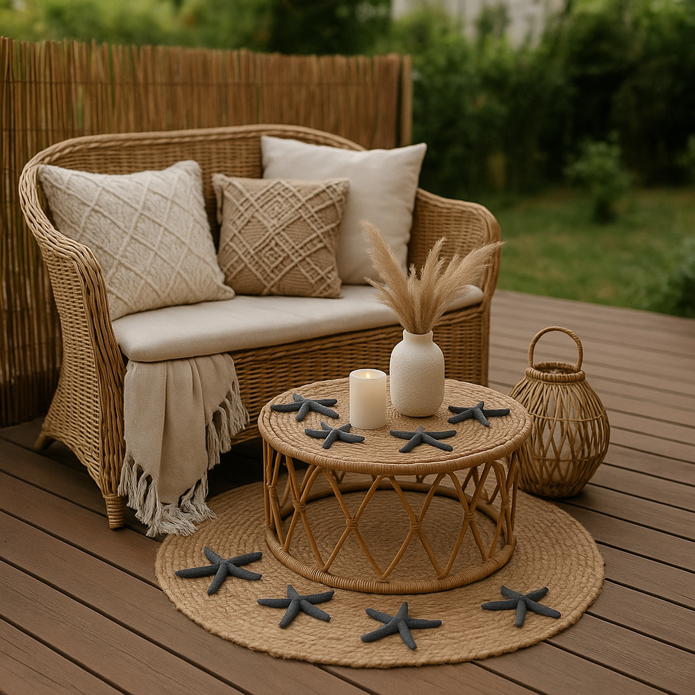 Dekoracje balkonowe i tarasowe – wkomponuj je w naturalne kompozycje z roślinami, lampionami i wikliną.