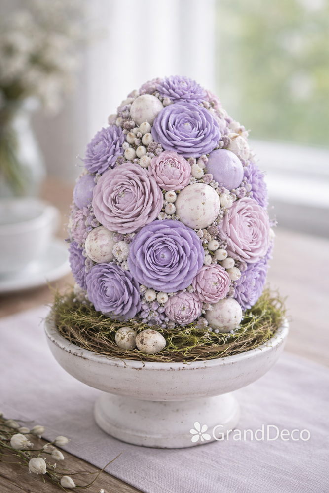 Puste miejsca między kwiatami uzupełnij drobnym suszem lub mini elementami dekoracyjnymi. Dzięki temu jajko będzie wyglądało na „pełne” i dopracowane.